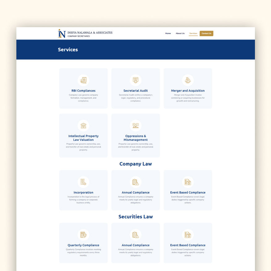 • Service Visibility: Clearly present service lines—Company Law, Secretarial Audit, Securities Law, RBI Compliances, M&A, IP, Valuation.