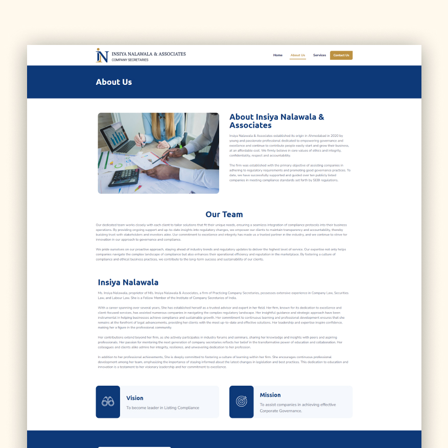 The live site positions Insiya & Associates as an authoritative legal advisory brand in Gujarat. With a structured service presentation and seamless inquiry paths, the website reinforces credibility, attracts corporate clients, and enhances digital presence in the legal domain.